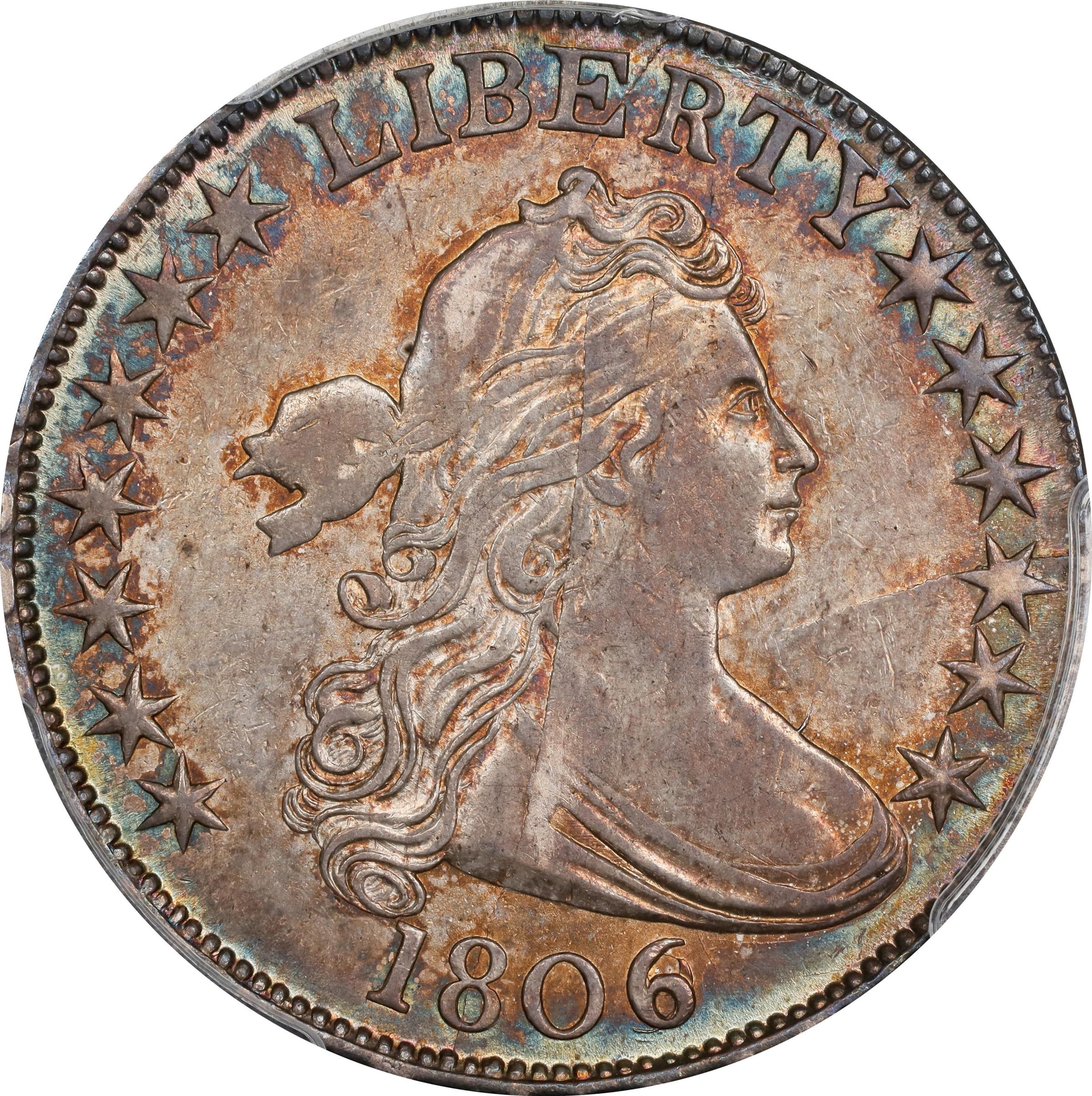 - Tompkins Die Stage 2/1. A wonderfully original example of this dramatic die pairing in the Draped Bust half dollar series. The peripheries are ringed in halos of iridescent powder blue that frame rose-red and silver gray centers. Due to sharp obverse die cracks, strike detail is always compromised on late stage examples of this Overton number. Here we see the usual softness on that side, most notably at star 11 and on the ribbon ends behind Liberty's head. The balance of that side is suitably bold, however, and the reverse is sharper overall with minimal softness in and above the center, but not to the point where any major design elements are seriously affected. With nice frosty luster remaining to minimally marked surfaces, this is a beautiful near-Mint early half dollar irrespective of date or die pairing.<p>This is the single finest example of the attribution known, and it sits comfortably at the top of the Condition Census above an AU-50 at CC#2, followed by a small number of Choice EFs. One of several highly significant offerings in this sale for advanced early half dollar variety enthusiasts, this unrivaled and unsurpassed 1806 O-112 belongs in the finest cabinet, in which it will serve as a leading highlight.