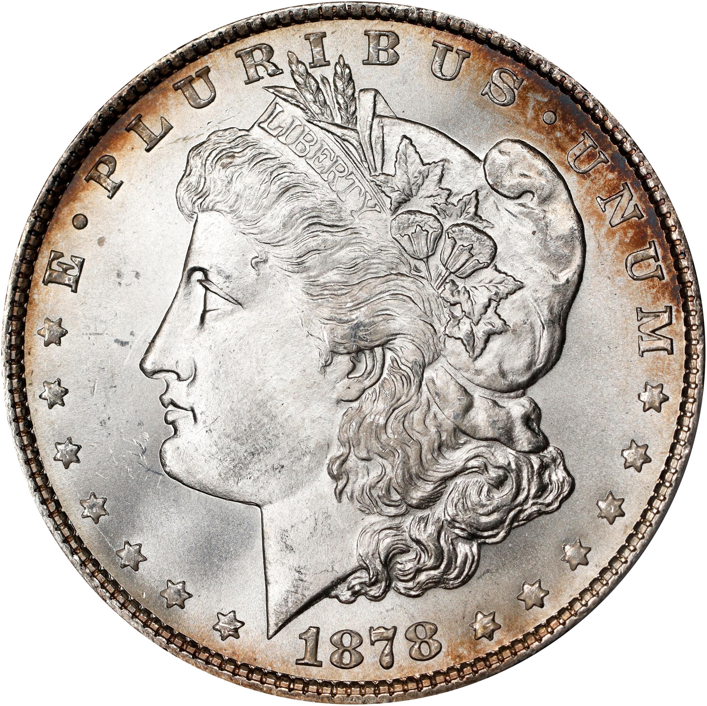 - Beautiful peripheral toning in iridescent reddish-apricot frames otherwise brilliant, silver-white surfaces. Both sides are fully lustrous and universally satiny in texture. All design elements are sharply to fully defined from a razor sharp strike, and all areas are expectably smooth for the assigned grade. A phenomenal condition rarity and visually appealing premium Gem to represent this one year hub type from the inception of the Morgan dollar series.<p>The 8 Tailfeathers reverse was used for only a few weeks beginning on March 12, 1878, at the onset of Morgan silver dollar production. While no records were kept regarding how many coins were made using this reverse design, the best estimate is that around 750,000 circulation strikes were made. Soon after, along with other design modifications and improvements, the number of tail feathers was decreased to seven and every subsequent issue bears this feather count.