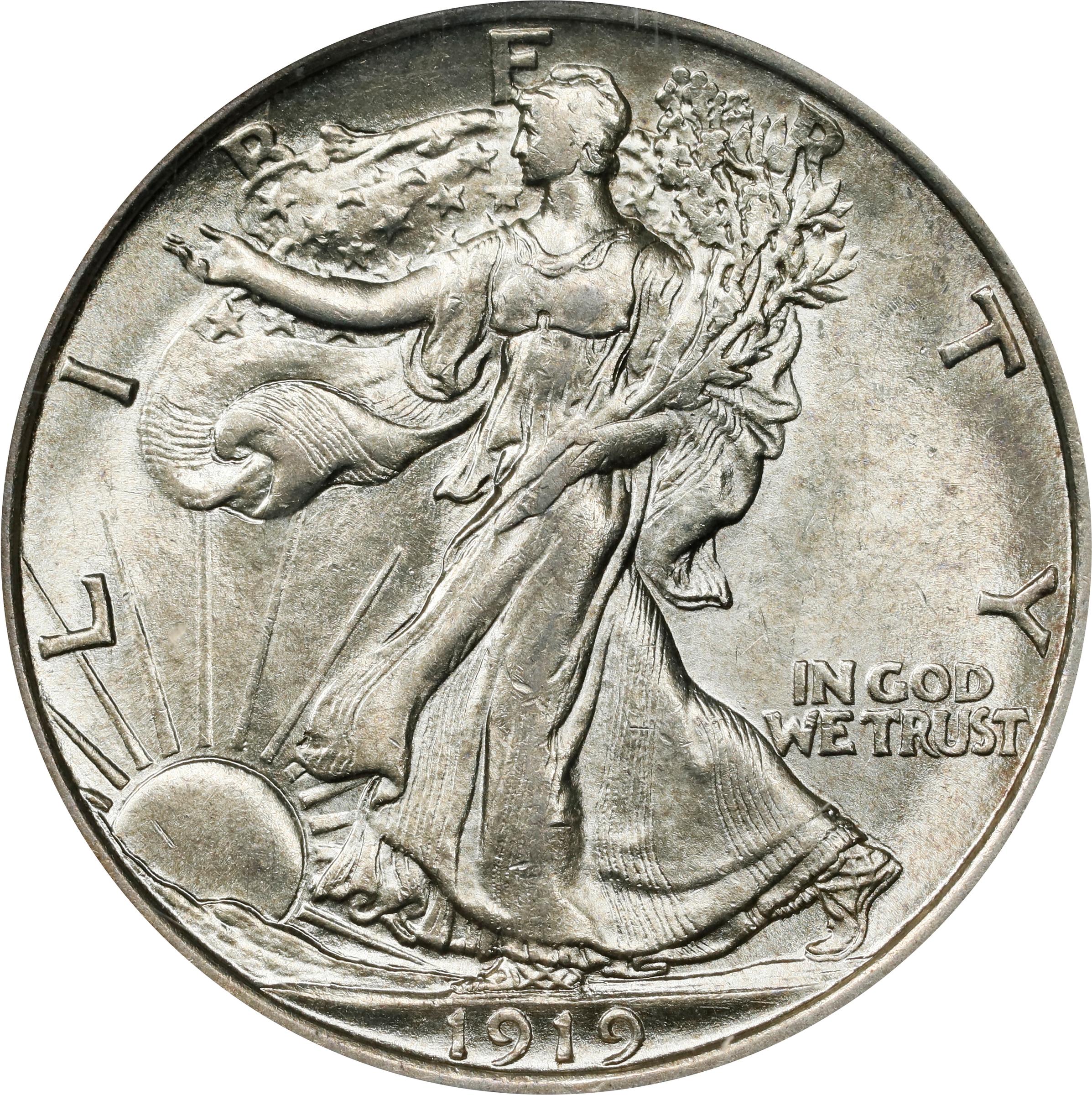 - A softly frosted and essentially brilliant example with surfaces that are smoother than one might expect at the assigned grade level. Characteristic softness of strike precludes a Select Mint State rating, but there is emerging detail in the centers, most notably on the obverse at Liberty's left hand. A leading strike and condition rarity in the Walking Liberty half dollar series, the 1919-D can be difficult to locate even in EF and AU. In Mint State this is the third rarest issue of its type, trailing only the 1919-S and the low mintage 1921-S. Even the 1921-D is a bit easier to obtain in Mint State than the 1919-D, despite a much lower mintage of 208,000 vs. 1,165,000 coins. A significant offering for the advanced Walking Liberty half dollar collector.