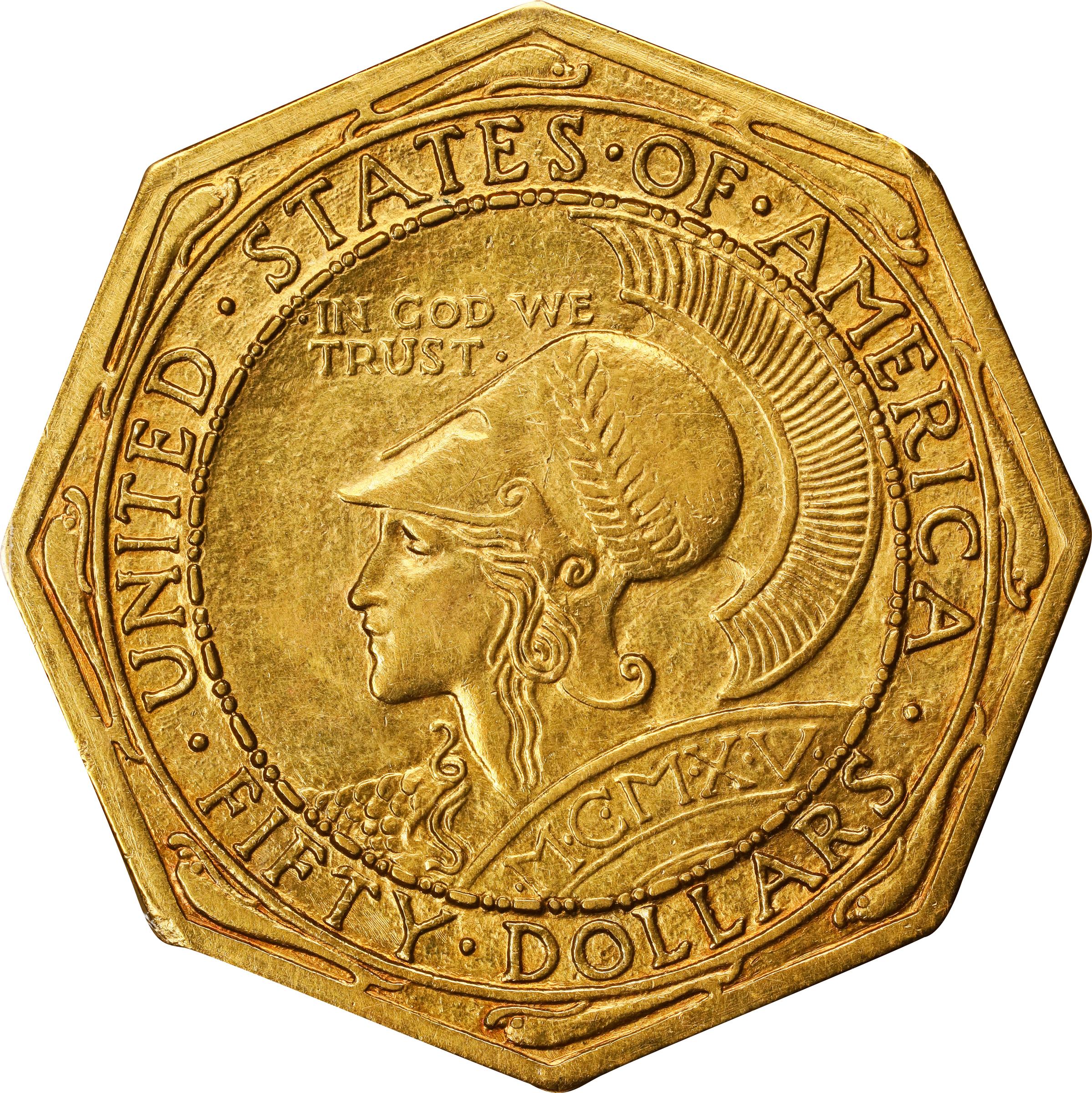 - This is an endearing coin for the grade, boldly defined overall with nearly complete mint luster remaining. Warmly patinated in honey-gold, as well, both sides are generally free from the large detracting marks that are often so prevalent on examples of this conditionally challenging type. With strong eye appeal further enhancing its desirability, it is difficult for us to imagine a more desirable Pan-Pac $50 of either variant at the Choice AU level.<p>One of five issues struck in association with the Panama-Pacific International Exposition celebrating the opening of the Panama Canal, the Octagonal variant of the $50 gold shares the same basic design as its Round counterpart. Both were designed by Robert I. Aitken, the obverse depicting Minerva, goddess of wisdom, skill, contemplation, spinning, weaving, agriculture, and horticulture. A helmet is pushed back over the top of her head, while at her shoulder is the top of a shield inscribed with the date, MCMXV (1915), in Roman numerals. The motto IN GOD WE TRUST is in the upper left field, the legend UNITED STATES OF AMERICA lines the upper border, and the denomination FIFTY DOLLARS is below. Aitken's reverse features Minerva's sacred owl perched on a branch of Western pine, complete with large cones and needles. The Latin motto E PLURIBUS UNUM is in the right field, while the inscription PANAMA-PACIFIC EXPOSITION / SAN FRANCISCO encircles the border. The Octagonal variant, represented here, includes an extra outer border on both sides, each with eight dolphins that symbolize the uninterrupted waterway created by the opening of the Panama Canal.<p>The San Francisco Mint struck 1,500 examples of each variant of Panama-Pacific $50 for sale at the Exposition. Due to their different shape and the addition of the symbolic dolphin border, the Octagonal pieces proved more popular with contemporary buyers, resulting in a greater distribution than the $50 Round. In truth, sales for both were disappointing, the original asking price of $100/coin proving too steep for most contemporary Americans. Attempts to increase sales by discounting the price of the $50s when offered as part of sets with the smaller denomination Panama-Pacific coins did little to improve the situation, and in the end most examples of both varieties were melted as unsold. The distribution for the Octagonal proved to be just 645 pieces, greater than that of 483 coins for its Round counterpart, but still a small total that explains the scarcity of survivors in today's market. Eagerly sought in all grades, and understandably so, we anticipate keen bidder interest in this pleasing PCGS/CAC AU-58 example.