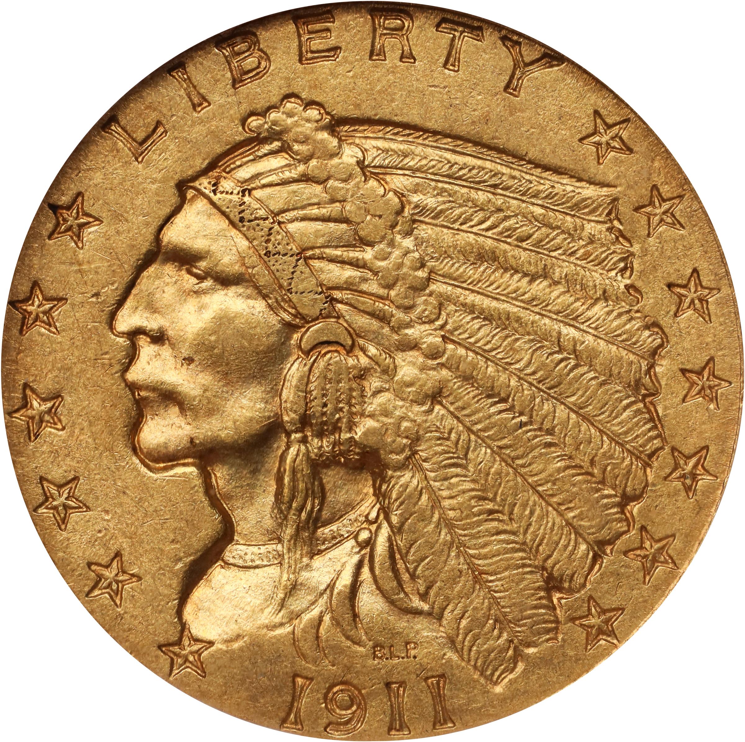 - Deep honey-orange surfaces with a tinge of warm olive, both sides also sport bold to sharp striking detail to all design elements. The mintmark is fully outlined and readily appreciable, as expected for a Strong D example, although it is not designated as such by NGC. The key date issue among circulation strike Indian quarter eagles, the 1911-D is eagerly sought in all grades, especially those at the Mint State level.