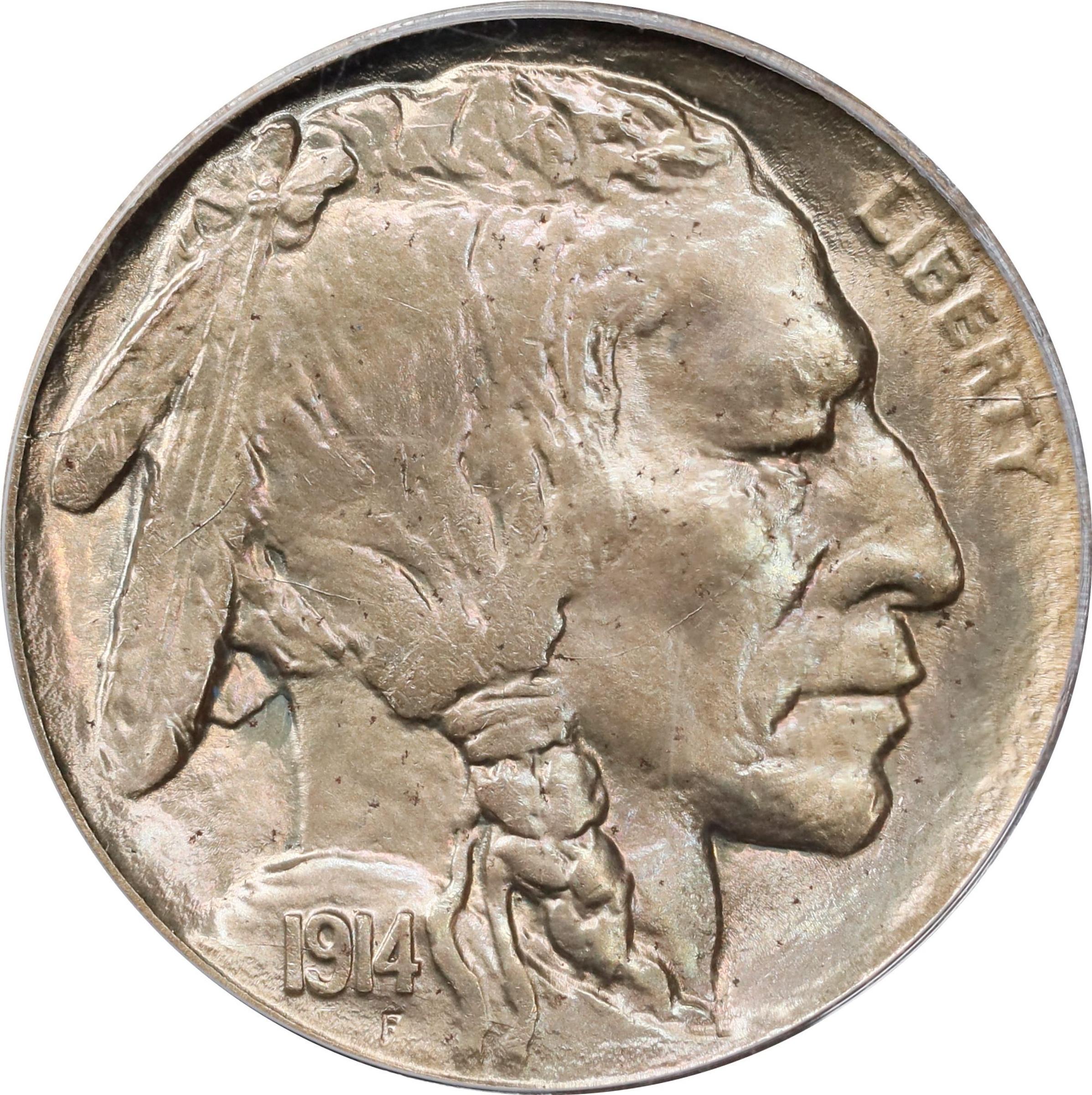 - Charming satin surfaces are dressed in vivid champagne-apricot iridescence, with tinges of powder blue and pale pink further enlivening the obverse. Strike detail is sharp to full throughout. Scarce even in worn condition, the 1914-D has a limited mintage for the type of 3,912,000 pieces. It is an important condition rarity when in CAC-approved MS-66, as here.