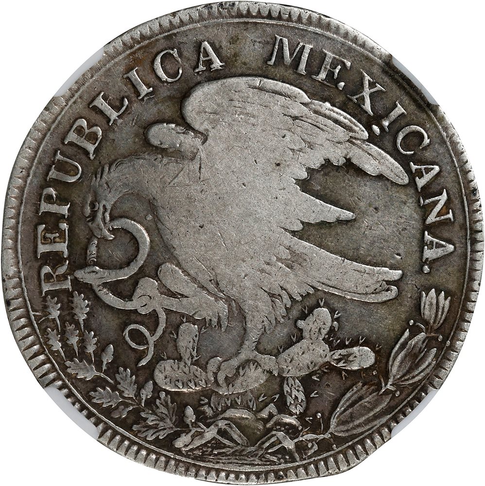 HOH-GO10/GR10; KM-A376.1; DP-Go02. Variety where superscript "s" of Granos overlaps ray. Snake's head aligns with center of "R". Diagnostic die chip under "I" of "MEXICANA". Wholesome and original, this well-worn example exhibits bold designs with even wear. The surfaces display a pleasing light gray tone with richer coloration amongst the devices and crevasses. Hints of iridescence pop out when tilted in the light coupled with minor earthen deposits adding to its originality and pleasing appearance. This date is encountered with far less frequency than other dates or mints and should be considered RAREand highly desirable. Last year of Hookneck production. The 1825 Hooknecks were minted only in Guanajuato and only in the first part of that year.